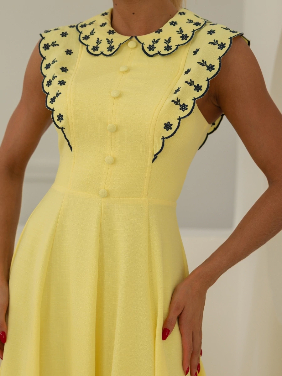 O vestido Margot é confeccionado em tecido leve e estruturado em um delicado tom de amarelo.