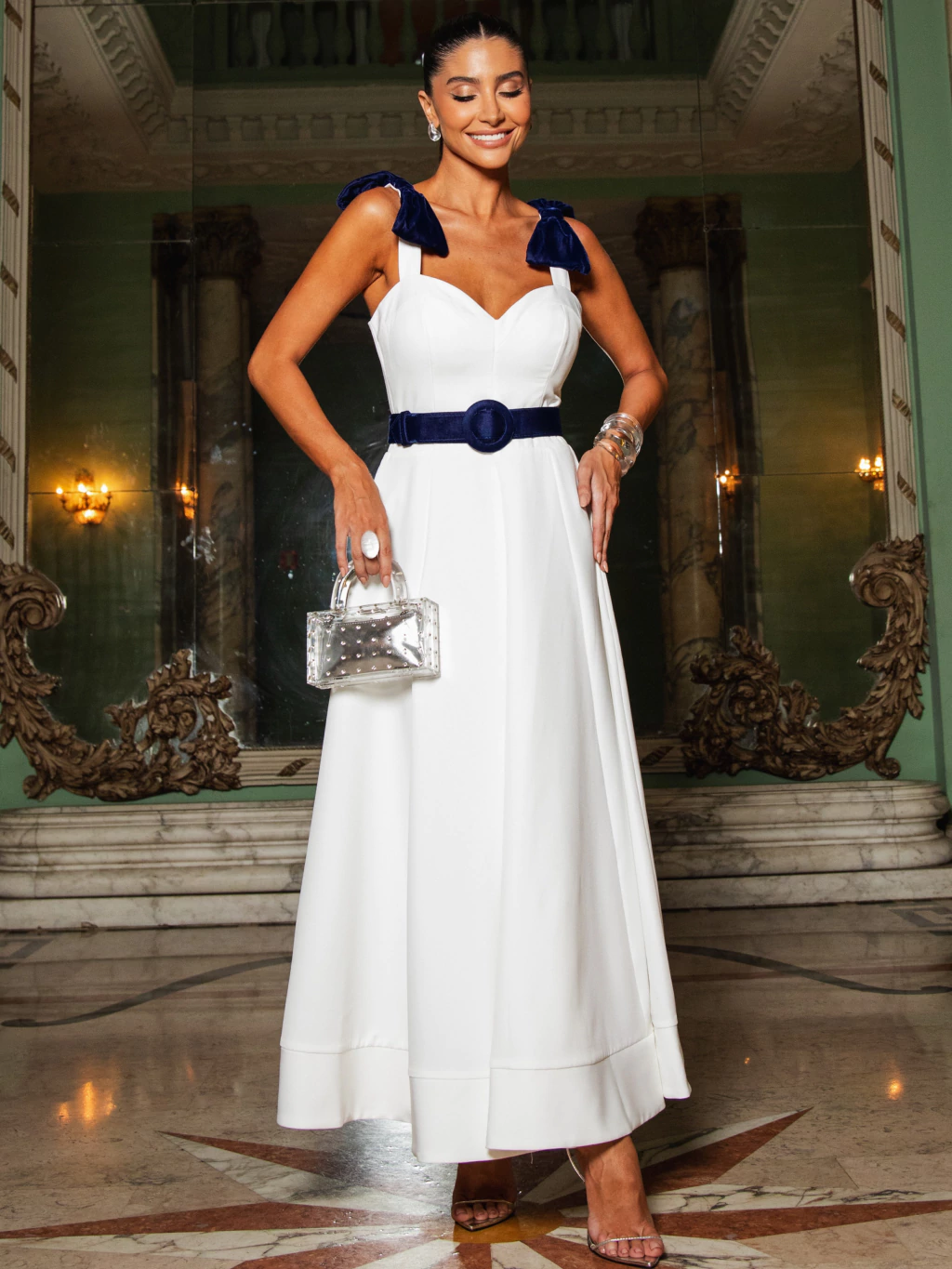 O decote em “coração”, com recortes precisos e alças largas, valoriza a silhueta com um toque romântico e refinado. O zíper de metal nas costas assegura praticidade, enquanto o cinto revestido em veludo azul marinho oferece um contraste de textura e cor que eleva o visual. As delicadas aplicações de laços de veludo nos ombros acrescentam um charme singular e exclusivo à peça.