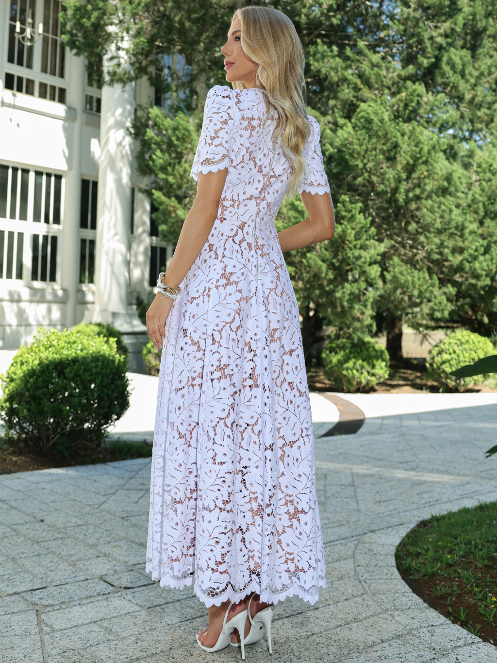 O forro em tom nude realça o desenho da renda com suavidade, proporcionando um contraste sutil e elegante. Ideal para casamentos ao ar livre, jantares especiais ou celebrações mais intimistas, é uma peça que traduz beleza e encanto com naturalidade.
