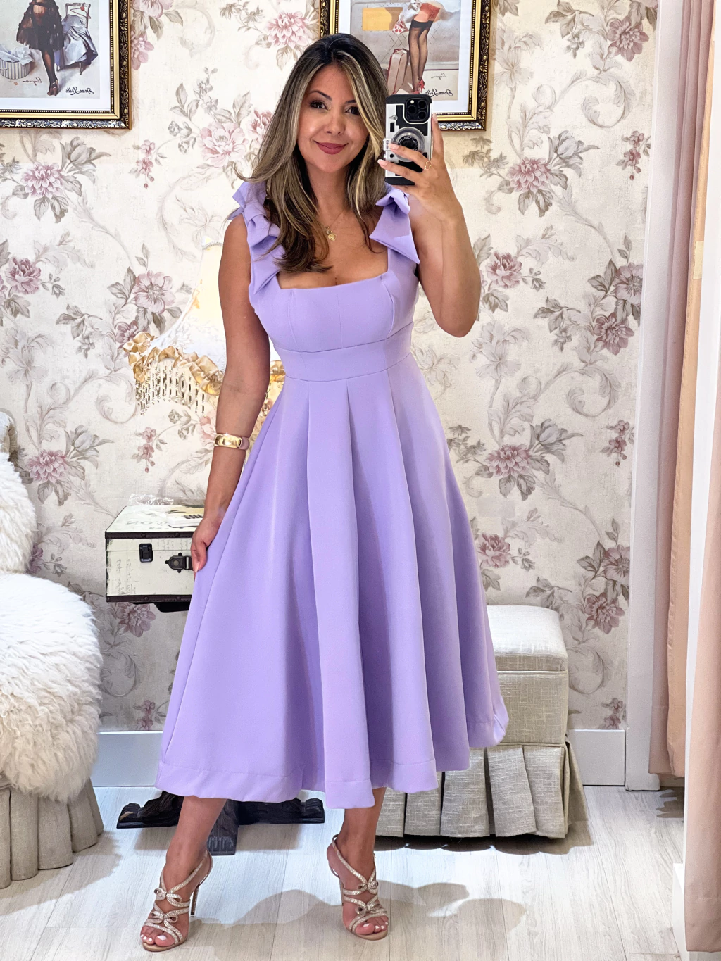 Alfaiataria com bojo, o corte impecável da saia rodada acrescenta graciosidade a cada passo, enquanto o comprimento midi harmoniza sensualidade e elegância com perfeição.
