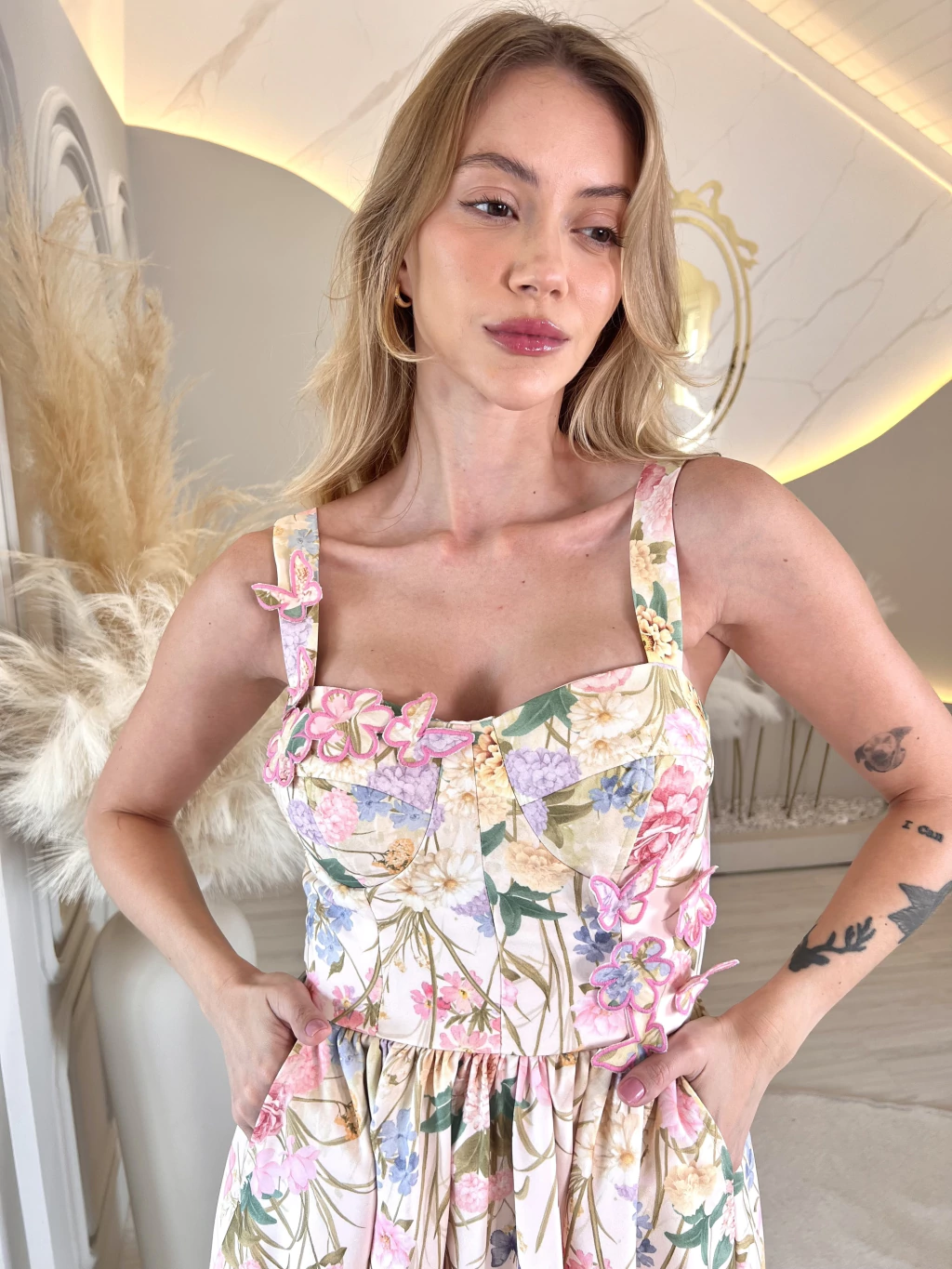 Com decote coração e busto estruturado, o modelo valoriza o colo com sutileza, enquanto as alças médias com aplicações florais em relevo adicionam charme e textura artesanal ao visual.