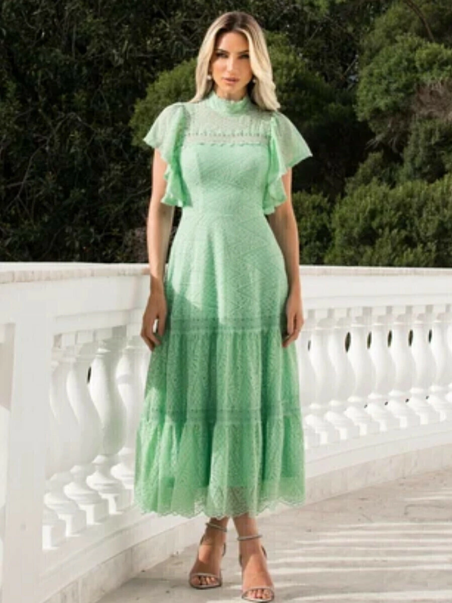 Vestido midi em renda estruturada, com gola alta e recortes estratégicos no busto. Possui mangas fluídas em camadas e modelagem acinturada que valoriza a silhueta. O forro embutido garante conforto, enquanto o acabamento em zíper nas costas assegura ajuste impecável. Um modelo que une romantismo e sofisticação, ideal para cerimônias ao ar livre e celebrações durante o dia.