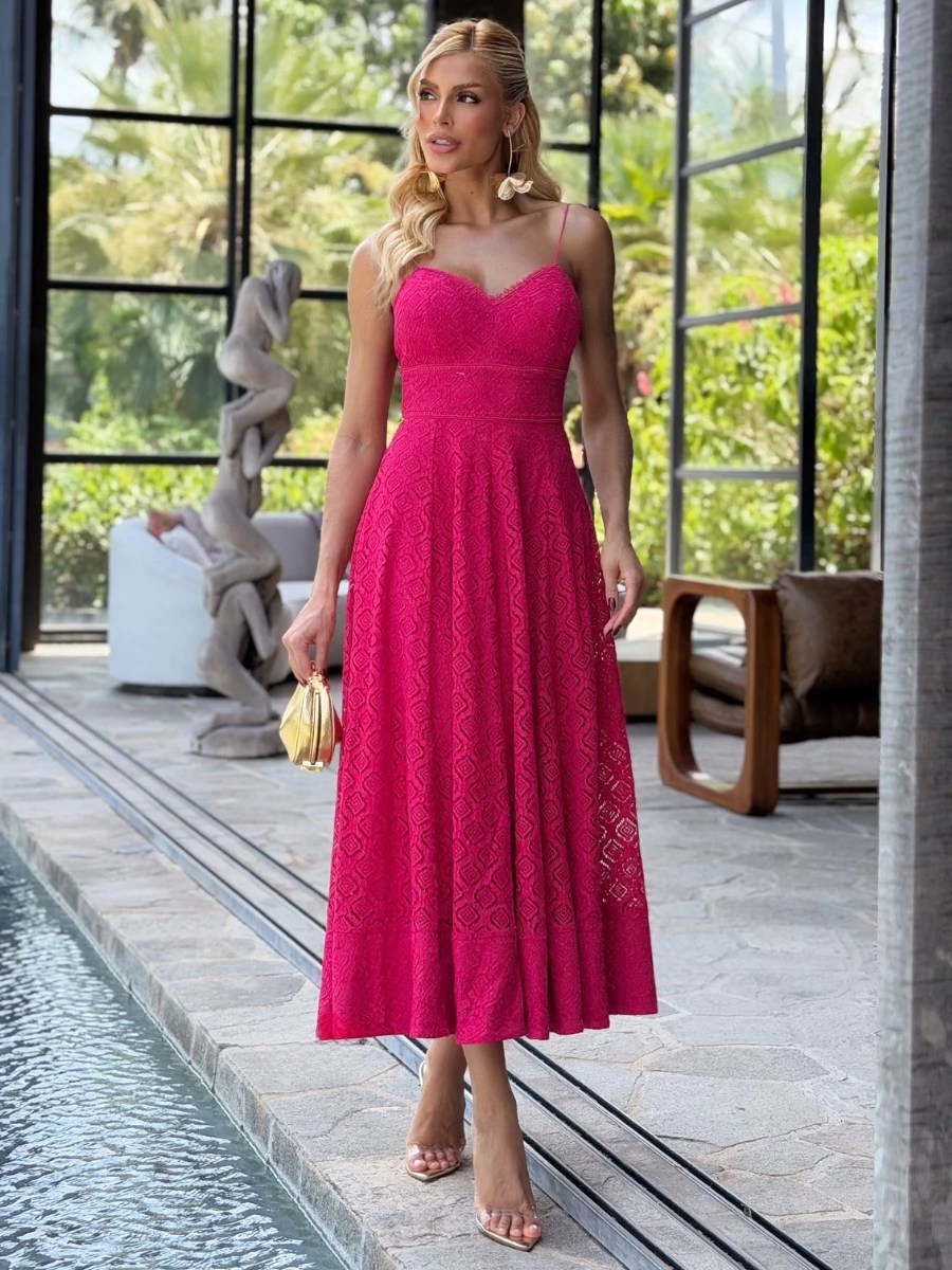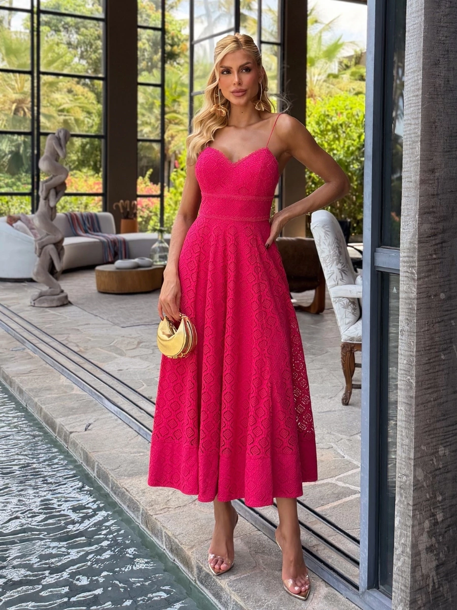 O Vestido Sofia é uma peça que traduz sofisticação, charme e romantismo. Inspirado na elegância das paisagens costeiras italianas, o modelo da coleção Bella Di Mare une o design clássico da renda estruturada com o toque moderno da cor vermelho cereja, resultando em um visual inesquecível para ocasiões especiais.
