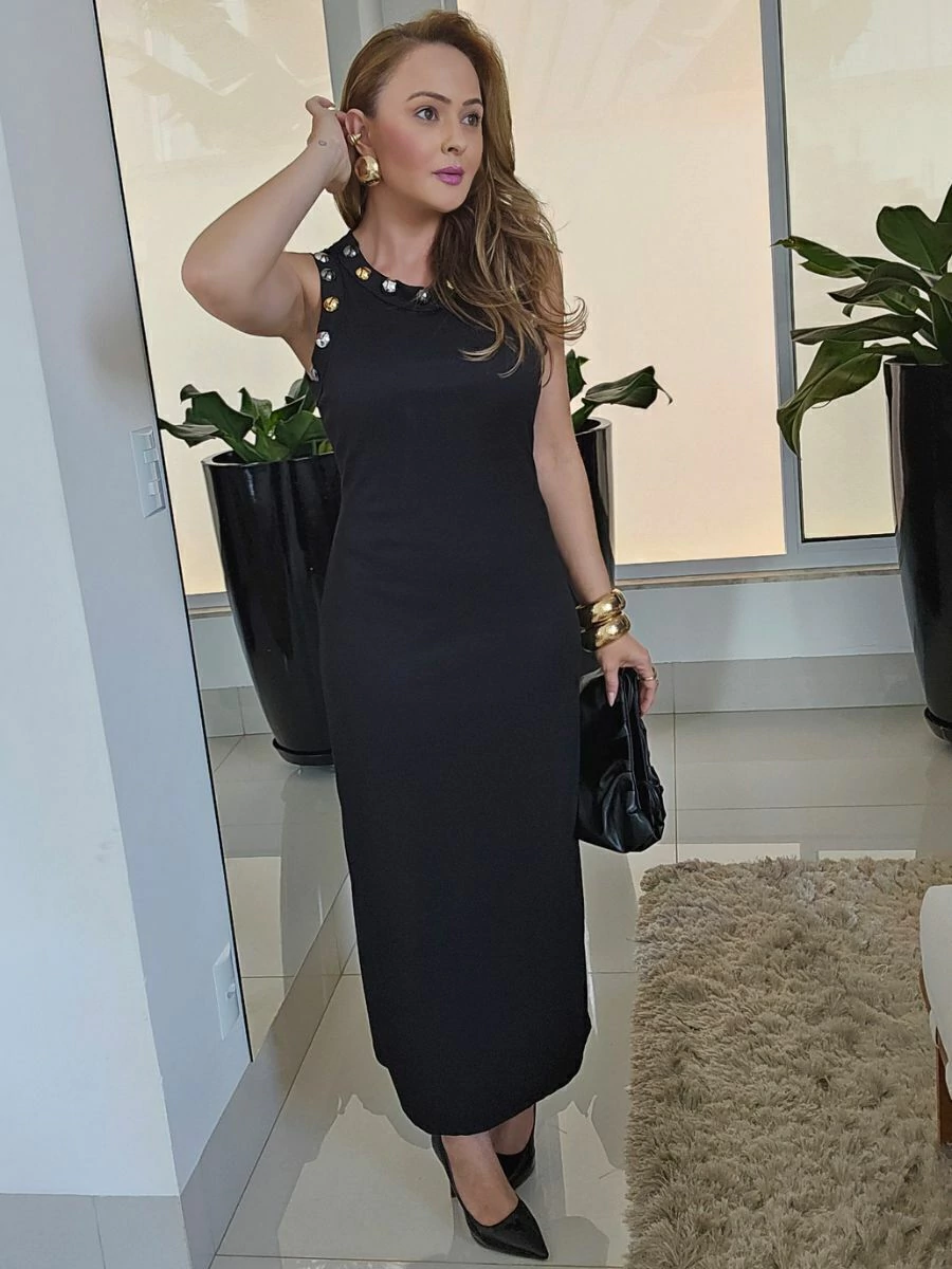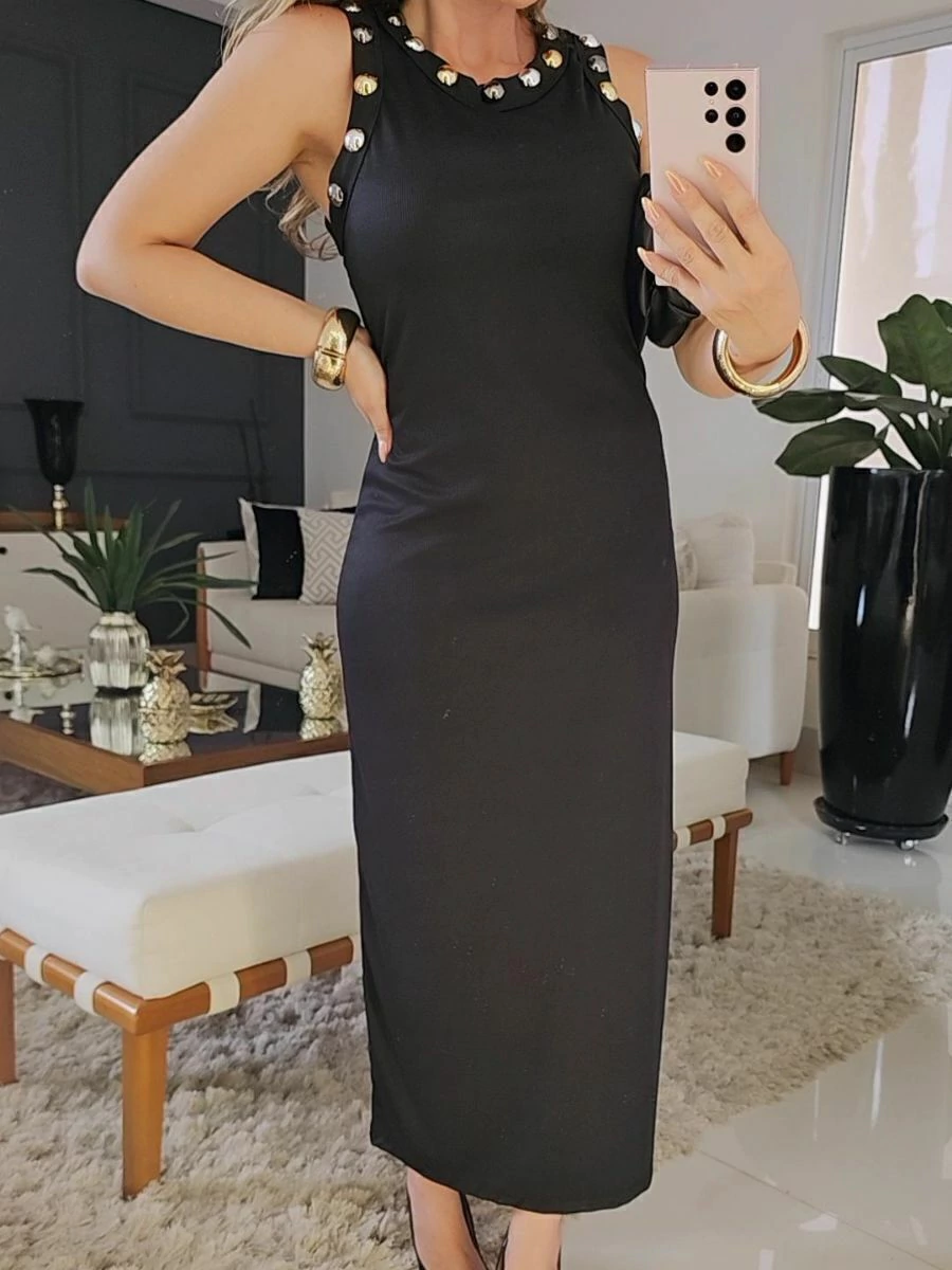 Vestido Sophie canelado, forrado na cor preta e com aplicação de spikes para um toque poderoso. Sem zíper, garantindo conforto e caimento impecável.