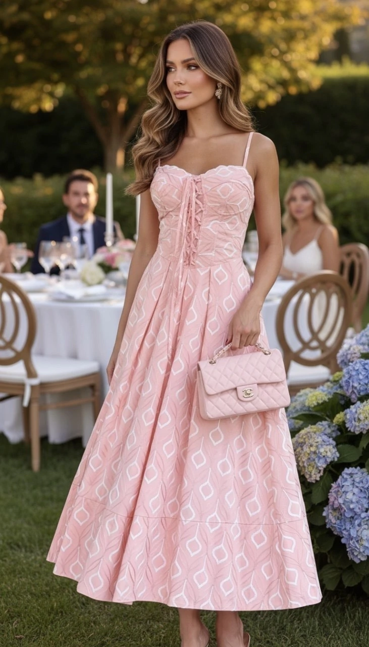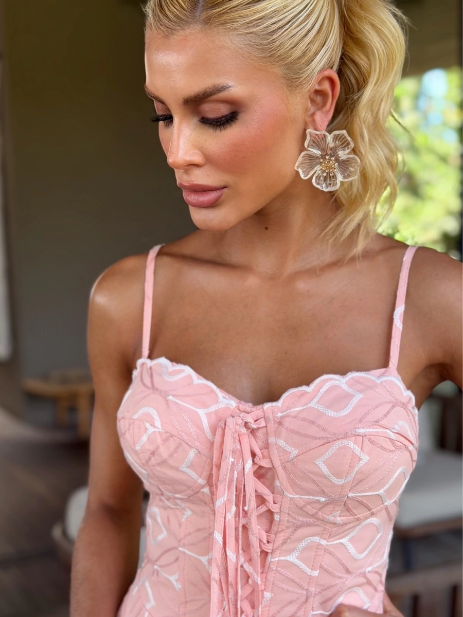Modelagem valorizadora: o decote corset com amarração frontal e a cintura marcada realçam a silhueta com elegância.