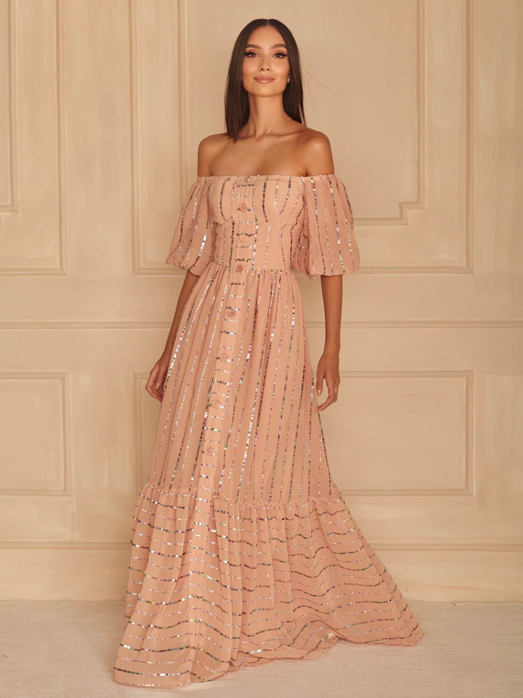 Apresentamos o vestido ombro a ombro em chiffon rosé, uma criação de alta costura que traduz com perfeição a união entre leveza e elegância. Bordado com mini paetês em tons suaves, o vestido reflete a luz com discrição e sofisticação. Os botões em madrepérola acrescentam um toque refinado e atemporal, enquanto o recorte delicado valoriza o busto com naturalidade e equilíbrio.